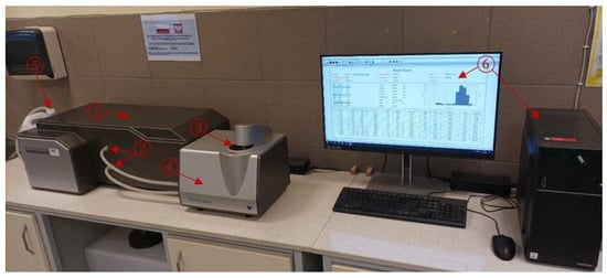 View of the Bettersizer S3 Plus laser particle size analyzer test stand located in the Department of Military Engineering and Infrastructure of the MUT, with markings of crucial components ①–⑥.