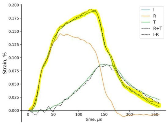 In the experimental methodology of SHPB testing, an important step is the selection of a suitable impulse shaper to ensure dynamic stress equilibrium. The introduction of an additional impulse shaper into the SHPB test stand system between the bar projectile and the initiating bar allows for a longer time of rising impulse, which enables the effect of better impedance matching and homogeneous deformation of the test material. The pulse shaper is usually a small and thin disc made of soft material—it can be made of aluminum, brass, rubber, nylon, copper, or stainless steel, about 0.1–2 mm thick [58]. During testing, the bar projectile strikes the impulse shaper in front of the initiating bar, thus generating a non-dissipative impulse propagating through the initiating bar. This pulse, with its slowly rising front, facilitates dynamic balancing of forces on the sample—a slowly rising pulse is the preferred loading pulse to minimize the effects of dissipation and inertia, thereby facilitating dynamic stress balance in the sample. The task of the pulse shaper is to ensure a constant strain rate during loading and to maintain force balance throughout the specimen. By changing the geometry of the pulse shaper, a variety of different pulses incident on the specimen can be produced. Depending on the materials being tested, different loading pulses are needed, which can be achieved by designing the shaper accordingly. The dynamic stress equilibrium condition is shown in Equation (3):