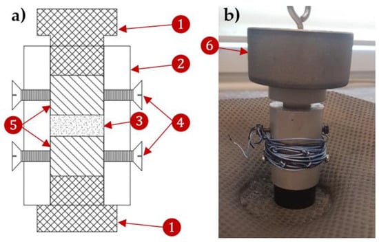 In accordance with the conclusions of the publication [60], the compaction process of the sample was carried out on a vibrating shaker. The soil was compacted by vibrating the shaker for 60 s. The tests carried out in [60] proved that a time of 60 s was sufficient—the vibration process for longer periods of 120 s and 180 s did not result in a significant increase in soil compaction values. A sinker weight of approximately 1000 g was applied to the sample to improve the effectiveness of the shaking compaction. During the shaker operation, the air voids were filled by the moving soil grains—the compaction process took place. Figure 10 shows the soil sample casing (rigid ring) and the auxiliary components necessary for the compaction process of a soil sample, with their markings: