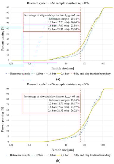 - Repeatable trends in changes in the granulometric composition of soil samples were observed and shown graphically on grain size curves. The largest percentage change in granulometric composition through an increase in the value of the silt and clay fraction relative to the reference sample fSi+Cl for both types of silty sand tested occurs for the same moisture content variant w2 = 5%—for soil fSi+Cl,1 = 15.14%, there is an increase in the fine fraction of 11.08%, and for soil fSi+Cl,2 = 20.48%, there is an increase in the fine fraction of 15.17%.
