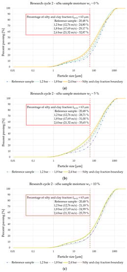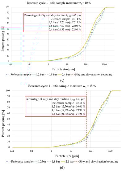 - For the first type of soil sample fSi+Cl,1 = 15.14%, the most significant is the bar projectile impact at an initial launcher pressure p2 = 1.8 bar for all sample moisture contents variants w1 ÷ w4—at this pressure p2, the greatest percentage change in granulometric composition occurs through an increase in the value of the silty and clay fraction fSi+Cl,1-k relative to the reference sample fSi+Cl,1. On the other hand, for the second type of soil sample fSi+Cl,2 = 20.48%, the greatest percentage change in granulometric composition occurs with a bar projectile impact at an initial launcher pressure p3 = 2.4 bar for all moisture content variants w1 ÷ w4—at this pressure p3, the greatest percentage change in granulometric composition occurs through an increase in the value of the silty and clay fraction fSi+Cl,2-k relative to the reference sample fSi+Cl,2.