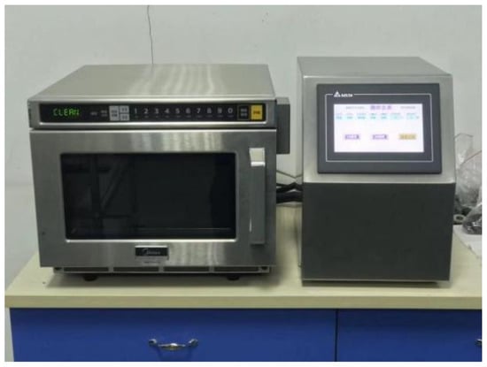 A Midea EMB17G4V-SS commercial microwave oven was used in the microwave irradiation tests. In the commercial resonant cavity, an infrared temperature measuring device and a data acquisition device were added, which could real-timely measure and record temperatures at a certain point on the sample surface, with the temperature measurement range of 0 to 1300 °C, as shown in Figure 1. The rated voltage, rated frequency, and rated power input of the commercial microwave oven were 220 V, 50 Hz, and 3200 W, respectively. The operating frequency and the maximum power output of microwaves were separately 2450 MHz and 2100 W, and the power was continuously adjustable within the range from 100 to 2100 W.