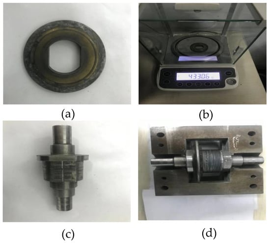 Installation of the reduced-scale TBM cutter and the fixture: (a) Reduced-scale TBM cutter; (b) Cutter weighing; (c) Cutter shaft; (d) Cutter fixture.