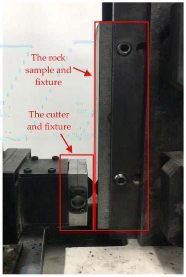 The cutter wear and cutting tests were conducted on the combined abrasion test device for the SP3-I TBM cutter. The material of the reduced-scale TBM cutter used is H13, the diameter of the cutter ring is 48.26 mm, the surface hardness of the cutter ring is 58HRC, the blade width is 1.5 mm, and the ratio of the prototype TBM cutter is 1:10. The bearing specification is 6800ZZ deep groove ball bearing with an inner diameter of 10 mm and outer diameter of 19 mm. Before testing, the reduced-scale cutter was first wiped with acetone and then weighed using a balance with a resolution of 0.001 g after being dried. Thereafter, the reduced-scale cutter was fixed on the fixture (Figure 4), which was then mounted on the test device. After adjusting the reduced-scale TBM cutter to the lower part of the sample, a basalt sample was fixed on the fixture (Figure 5). In the process of cutting rocks, the three-dimensional cutting forces (driving force and rolling force) applied on the reduced-scale TBM cutter were measured by the three-way force sensor on the tool apron.