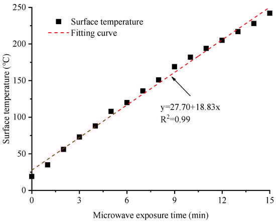 After microwave irradiation, the surface temperature of the samples increases with prolonged increasing exposure to microwave irradiation in a linear manner (Figure 6). After 15 min of microwave irradiation, the highest surface temperature of the sample reached 242 °C, and the temperature increased at 18.83 °C/min. Microwave irradiation increased the temperature of the rock sample because different mineral components in the rock transformed the microwave energy into thermal energy after absorbing microwave energy, which was related to the comprehensive dielectric properties of the rock. Basalt, as a mineral with strong microwave absorption capacity, experiences a significant increase in temperature after microwave irradiation [20].