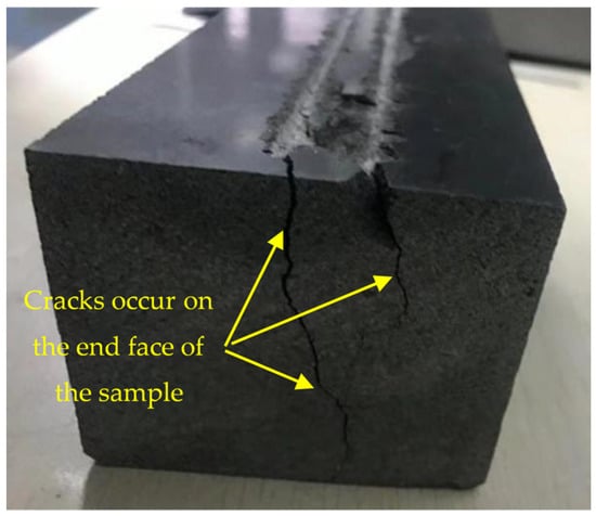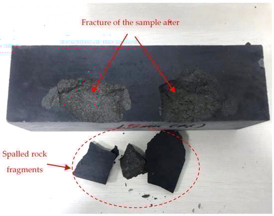 After microwave irradiation for different durations, cracks propagate to different degrees on the surface of basalt samples. The longer the exposure to microwave irradiation, the more significant the crack propagation. After 16 min of microwave irradiation, the samples burst apart and fractured (to ensure that cutting tests of the reduced-scale TBM cutter could be conducted, and the longest microwave heating exposure was set to 15 min in the tests), as shown in Figure 7. After microwave irradiation, the bursting and fracturing of samples were caused by different degrees of thermal expansion of different mineral components in the rock after absorbing microwave energy and being heated. As a result, intergranular and transgranular fractures occur in and between minerals in the samples [25]. With increasing exposure to microwave irradiation, the microcracks occurring in the rock develop to form macrocracks. After the thermal expansion of minerals in the rock accumulates to a certain extent, the thermal stress generated in the rock enables the bursting and fracturing of the rock [26].