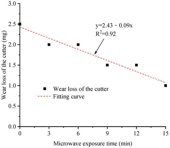 The reduced-scale TBM cutter after cutting the rock was weighed, and the results are displayed in Table 1 and Figure 8. As the increasing exposure to microwave irradiation increases, the wear loss of the reduced-scale TBM cutter gradually reduces in a linear relationship with the increasing exposure to microwave irradiation. This is to some extent because microwave irradiation damages the internal structure of the basalt sample. With the increase in the increasing exposure to microwave irradiation, the damage to the internal structure of the rock is intensified, which results in a gradual reduction in the wear loss of the reduced-scale TBM cutter when reaching the same penetration depth and cutting distance. Microwave irradiation reduces the wear loss of the cutter, indicating that microwave irradiation can prolong the service life of the cutter. In practice, this can shorten the time taken changing tools and decrease the repair frequency of TBM equipment, reduce the number of cutters used, and therefore save money.