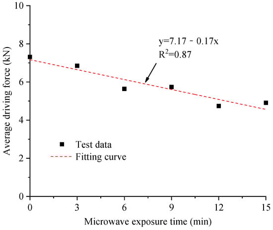 Figure 11 and Figure 12 show that the average driving force and the average rolling force of the reduced-scale TBM cutter decrease in a quasi-linear manner with increasing exposure to microwave irradiation when the penetration and cutter spacing are fixed. After 15 min of microwave irradiation, the average driving force and the average rolling force are separately decreased by 33% and 32%. This finding suggests that microwave irradiation can reduce the driving force and rolling force needed by the TBM disc cutter to cut the rock. The average driving force and average rolling force can be used separately to predict the thrust and torque of the TBM cutter head in the tunnelling process [28]. This indicates that microwave irradiation reduces the thrust and torque of the cutter during TBM tunnelling and allows the disc cutter to cut the rock more easily from surface to interior under the preset penetration degree and thus fracture the internal part of the rock. This reduces the pretorque needed by the cutter and drives the cutter to roll forward to break the rock continuously.