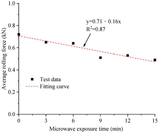 The reduced-scale TBM cutter is subjected to forces in three directions during the cutting of basalt samples, namely, the driving force, rolling force, and lateral force, among which the lateral force is negligible. According to the working principle of the combined abrasion test bench for the reduced-scale TBM cutter used in the research, the rock is broken under the reciprocating rolling of the cutter. Therefore, the research mainly explored the relationships of the driving force and rolling force with increasing exposure to microwave irradiation. Table 3 and Table 4 show the average driving force and average rolling force at different microwave exposure times. Figure 11 and Figure 12 illustrate the relationships of the average driving force and the average rolling force of the reduced-scale TBM cutter with different exposures to microwave irradiation.