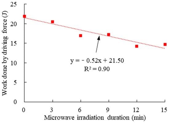 Table 5 and Table 6 show the work done by the average driving force and average rolling force at different microwave exposure times. Figure 13 and Figure 14 illustrate changes in the work done by the average driving force and that done by the average rolling force of the reduced-scale TBM cutter calculated using Equation (1) with increasing exposure to microwave irradiation. The energy consumed by the work done by the driving force and that done by the rolling force is both linearly reduced with increasing exposure to microwave irradiation. That is, as the increasing exposure to microwave irradiation prolongs, the energy associated with the work done by the driving and rolling forces decreases. After 15 min of microwave irradiation, the work done by the driving and rolling forces separately decrease by 33% and 32%. This indicates that microwave irradiation can reduce the energy consumption of the TBM cutter. In addition, a comparison of energy consumption of the work done by the driving force and that done by the rolling force shows that the energy associated with the driving force is about 0.08% of that associated with the rolling force. This indicates that the energy used by the TBM cutter in breaking rocks is associated mainly with the rolling force. When designing and setting a microwave antenna on the TBM cutter, one can follow the principle of mainly reducing the torque delivered by the TBM cutter.