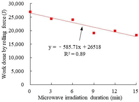 Relationship between the work done by the rolling force and the microwave exposure time.