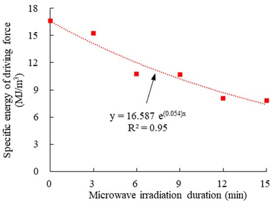 Relationship between the specific energy of the driving force and the microwave exposure time.