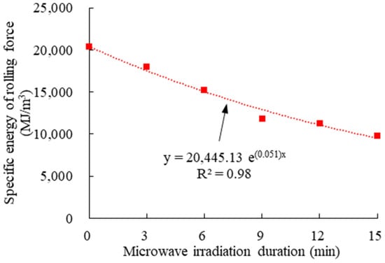 Relationship between the specific energy of the rolling force and the microwave exposure time.