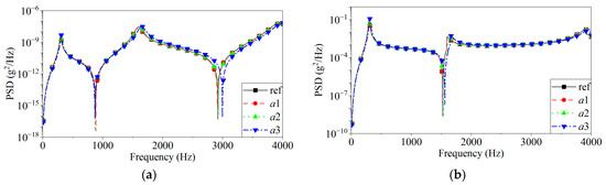 The PSD curves of acceleration under different thermal loads for points located at x = 150 mm, 100 mm, and 75 mm are shown in Figure 9. Analysis reveals that with an increase in thermal load, the structural response frequency shifts towards lower frequencies, and the higher-order response exhibits a significantly greater shift than the fundamental frequency, while the peak value of the lower-order response slightly decreases. Influenced by the variation of modal frequencies, the anti-resonance peak shifts noticeably towards lower frequencies.