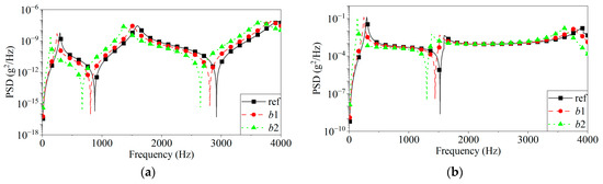 PSD contour of acceleration in the z-direction under different thermal loads (g2/Hz): (a) case b1; (b) case b2.