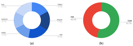 Class distribution for emotions dataset used in this study is shown. (a) class distribution of six basic emotions; (b) class distribution of hot and cold emotions.