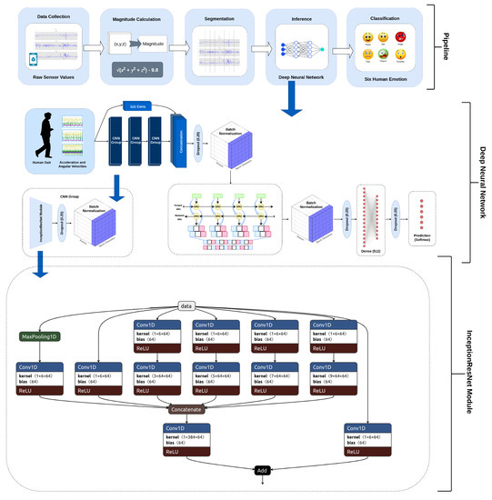 The proposed architecture for classifying human emotions consists of the Convolutional Neural Network – Recurrent Neural Network (CNN-RNN) model. The CNN-RNN models were first proposed for image-captioning applications [50], where the CNN models are used to extract visual features from images followed by the recurrent units such as the gated recurrent unit (GRU) [51] or long short term memory (LSTM) [52] to generate captions. The model we proposed comprises two InceptionResNet [53] inspired CNN modules built on a bidirectional RNN [54], consisting of a bidirectional-GRU with 128 units (see Figure 3). The feature map created by the CNN module was concatenated with the raw signals through a connection of a 1 × 1 convolutional layer. To keep the spatial dimensions identical, we used 1 × 1 convolution operations. A total of 64, 1 × 1 kernels were applied to the raw sensor data. This concatenation was inspired by DenseNet [55], which is an image classification model. The benefit of InceptionNet [56] is that it has variable-sized kernels that enable it to detect features of different sizes. Similarly, the ResNet [57], or having a residual connection, lets the model learn the identity; thus, the model is capable of bypassing a module if it does not contribute to classification. For the sequential data, RNNs perform better; therefore, the feature map generated by the CNN modules is given to the bidirectional GRU. The motivation behind introducing the dense connection was that, if CNNs are of no benefit, the raw sensor data are still processed by RNNs resulting in a better classification accuracy. To the best of our knowledge, this type of dense connection, where a feature map generated by CNNs is concatenated with the raw signals, has never before been experimented with for any kind of classification problem. In our experimentation, we found that this significantly improves the performance of the entire model. Figure 3 shows the overall proposed architecture and presents the InceptionResNet modules that are incorporated into the model.
