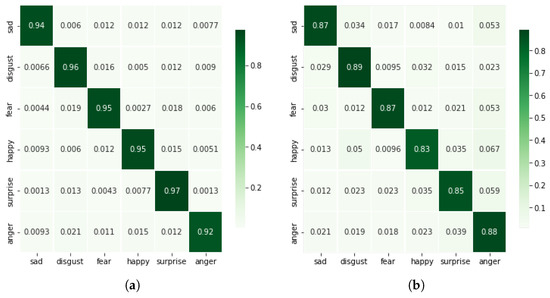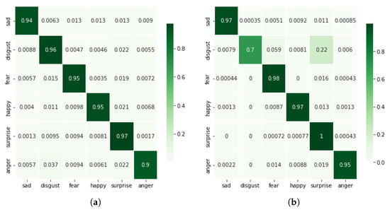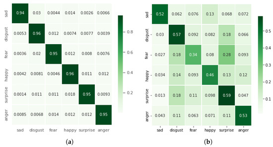 The performance for this case is comparable with the first case, i.e., the magnitude of 3D accelerations; however, the complexity of the model is increased here mainly due to the change in input size to 3D. A comparison with other cases is given in Table 2. It is observable that the accuracy for this case is 94.56%. Figure 6a shows the confusion matrix and minimal confusion is seen between different classes. The highest levels of confusion are present between anger and disgust, i.e., 3.7%.