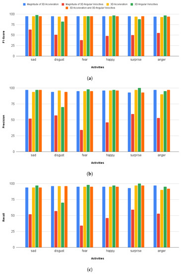 The main objective of this research activity was the classification of emotions using a deep model with reduced complexity. This was achieved by reducing the input feature space by computing the 1D magnitude of 3D accelerations. Figure 4a shows the confusion matrix computed with a 1D magnitude of 3D accelerations. The average classification accuracy of 95.23% was achieved for six basic emotions. Furthermore, the F1-score, recall, and precision remained at 95% (Figure 5). A significant improvement of 8.5% in classification accuracy was observed in comparison with the results reported by Hashami et al., [19], where the best accuracy of 86.45% was reported.