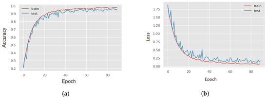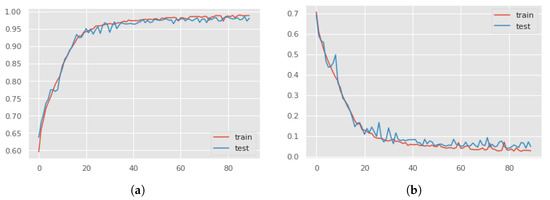 The accuracy curves (a) and the loss curves (b) computed with the magnitude of 3D accelerations as input signal using hot–cold mapping. The training and testing curves show a good fit, ruling out over-fitting.
