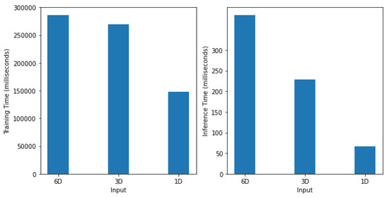Computation time required by the proposed model for the training (left) and inference (right) under different sizes of input signals, i.e., 1D (), 3D () and 6D (). With a 1D input size, the model is trained in 147,615 ms whereas the inference took only 67 ms.