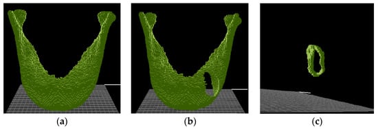 In related studies of bone defects, a “critically sized” defect was considered as one that would not heal spontaneously and which requires surgical treatment. The definition of a “critically sized” defect includes a defect length greater than 1–2 cm and a greater than 50% loss of the circumference of the bone []. During the surgery, the implant needs to match the defect position as much as possible and conform to the defect surface to restore the morphology and function of the mandible.