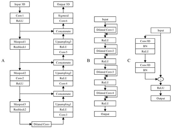The network contains six 3D convolutional layers, two residual modules, four 3D dilated convolutional layers, three max-pooling layers, three upsampling layers, and four skip connection structures. The network parameters are shown in Table 1, and the overall network structure is shown in Figure 7A.