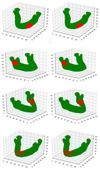 We visualized the repaired mandible (Sc) obtained by the 3DRDUnet network and compared it with the complete mandible (Sg); the results are shown in Figure 8. The images on the left are the repaired mandibles (Sc), where the red areas are the predicted defect parts (Ip). The images on the right are the complete mandible (Sg), where the red areas are the real defect implant (Ig).
