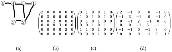 Representations of labeled graph, order matrix, adjacency matrix, and Laplacian matrix. (a) Labeled graph, (b) Order matrix, (c) Adjacency matrix, (d) Laplacian matrix.