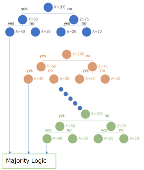 Random Forest creates decision trees by randomly selecting data samples, obtains predictions from each tree, and chooses the best solution by voting. For example, if five decision trees are created and three out of five are “A” and two are “B”, then “A” is selected. This is called “majority logic”. In addition, when it comes to regression problems, if five are predicted to be [4,8,10,12,14], it will be predicted with a mean of 9.6 and a median of 10.