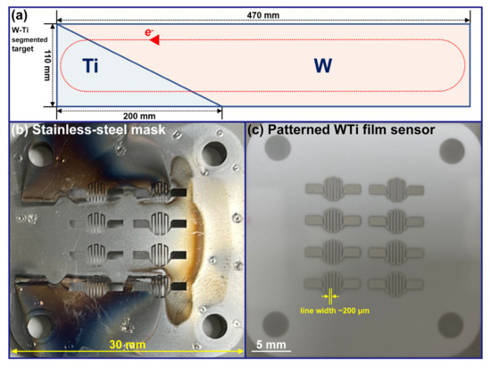 (a) Schematic diagram of the W-Ti segmented target, (b) image of the stainless-steel mask using for the WTi film deposition, and (c) image of the patterned WTi alloy film sensor.