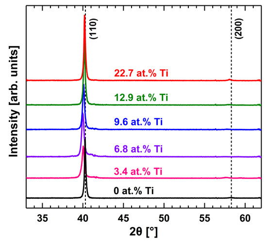 The phase structures of W and WTi alloy thin films were characterized, as shown in Figure 2. The prepared pure W thin film was single-phase α-W with (110) grain orientation (JCPDS No.040806). There were only (110) and (220) characteristic diffraction peaks of α-W in the WTi alloy films with different Ti contents, but no characteristic peaks of Ti, which indicates that there is no elemental Ti in the alloy films, and Ti is all solid dissolved in the W lattice to form a single-phase solid solution. With the increase in the Ti content in the alloy film, the more Ti in the solid solution in the W lattice, the more serious the lattice distortion. The atomic radius of W is 1.41 Å, and the atomic radius of Ti is 1.45 Å. Ti is dissolved using a solution in the lattice of W. Replacing the W atom increased the lattice constant, and the diffraction peak of (110) shifted to a low angle. However, the Ti is soft and a further addition of Ti (9.6~22.7 at.%) reduces the residual stress of the WTi films. With the increase in the Ti content, the full width at half maximum (FWHM) of the (110) diffraction peak increased obviously, and the grain size of the alloy thin film decreased. The average grain sizes of the films were estimated by Debye–Scherrer formula, using the FWHM value of the (110) XRD diffraction peaks. The calculated grain sizes of the WTi films with respect to the Ti content are presented in Table 3. It can be seen that the grain size decreases from 69.4 ± 1.2 nm down to 28.2 ± 1.9 nm with increasing Ti content from 0 to 22.7 at.%. Higher Ti concentrations mean more nucleation sites are provided and result in grain size refinement.