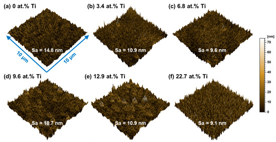 Due to the small thickness of the film sample, the resistance caused by the scattering of electrons on the film surface accounts for a large proportion of the total resistance, that is, the roughness of the film surface will affect the resistivity of the film. To study the surface roughness of the W and WTi alloy films, an AFM was used to characterize the surface roughness of the samples, as shown in Figure 4. The surface roughness of the pure W film was 14.8 nm. After Ti was added, the surface roughness of the WTi alloy film decreased. This is because the melting point of Ti is smaller than that of W, the undercooling degree of Ti is smaller in the sputtering process, and the diffusion ability is stronger. The roughness of the WTi alloy films with different Ti contents was about 10 nm, and the electron scattering ability of the film surface was similar.