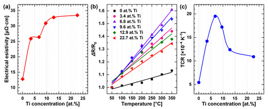 The resistivity of pure W film was 13.3 μΩ·cm, which increased rapidly to 25.9 μΩ·cm (3 at.% Ti) with the increase in Ti content. The highest resistivity was 33.5 μΩ·cm when Ti content was 22.7 at.%, as shown in Figure 5a. After Ti was dissolved in W, some W atoms were replaced, and lattice distortion occurred, the lattice vibration increased, the scattering effect of the lattice on electrons increased, and the resistivity increased. Figure 5b shows the thermal resistance curves of the W and WTi films. The resistance of W and WTi alloy films increased with the increase in temperature, indicating that W and WTi alloys have positive temperature coefficients. The TCR of pure W films was 5.4 × 10−4 K−1, and the TCR increased rapidly to 14.2 × 10−4 K−1 with the addition of a small amount of Ti. The resistance inside the grain was increased by the Ti replacement of part of W in the W lattice, which made the TCR increase. With the increase in the Ti content, the TCR of the WTi alloy films increased first and then decreased. When Ti content increased from 3.4 at.% to 6.8 at.%, the number of Ti atoms in the solid solution of the W lattice increased, which made the resistance inside the grain increase, the electron scattering ability of the lattice is enhanced, and the TCR increases. As the content of Ti continued to increase, the number of Ti atoms in solid solution further increased, and the TCR of Ti was less than that of W (TCRW = 0.0049/K, TCRTi = 0.0041/K), which made the TCR of the alloy thin film decrease. Moreover, with the increase in Ti content, the grain size of the WTi alloy film decreased, which also led to a decrease in TCR. When Ti content was 6.8 at.%, TCR reached the maximum value of 19.5 × 10−4 K−1. Compared with the pure W films, TCR increased by 3.6 times, and the linearity of linear fitting was very high, indicating that the WTi alloy films have good thermal resistance.