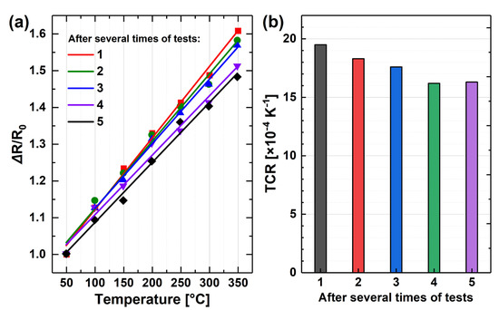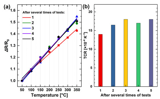 The repeatability of the 6.8 at.% Ti alloy film after annealing for 30 min was characterized, as shown in Figure 12. After annealing, the thermal resistance of the alloy film tends to be stable several times. Except for the first time, the thermal resistance curves of the other four times basically coincided, and the TCR also tended to be stable. The results show that, after annealing for 30 min, the structure of the 6.8 at.% Ti alloy film does not change and the thermal resistance remains stable.