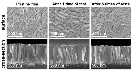 Surface and cross-section SEM images of the WTi alloy film with 6.8 at.% Ti after cycled-thermal-resistance measurements.