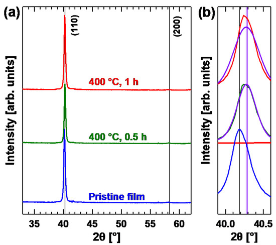 (a) XRD patterns of the WTi alloy film with 6.8 at.% Ti after vacuum annealing at 400 °C for 0~1 h and (b) expanded-scale XRD patterns around the W (110).
