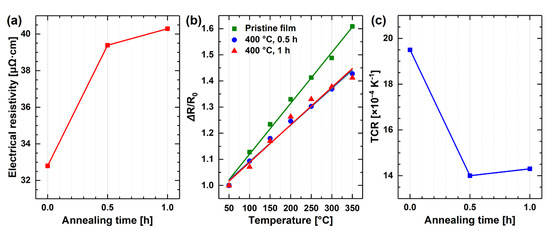 - Sun, B.; Wang, P.; Ma, B.; Deng, J.; Luo, J. Effects of annealing on the temperature coefficient of resistance of nickel film deposited on polyimide substrate. Vacuum 2018, 160, 18–24. [Google Scholar] [CrossRef]