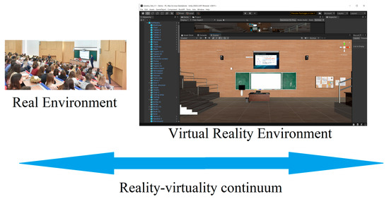 In this paper, we explore the benefits and limitations of using virtual reality applications for educational purposes, as well as VR capacity to enhance education outcomes and engagement to offer a broader personalized academic experience. The research is based on reviewing the current state of VR technology and its use in education. We also highlight the challenges of implementing such applications in an educational context, including third-party integrations and different instructional methods to meet student needs. Instruction is a primary way of teaching in accordance with pedagogical procedures and policies. Multimedia information resources are used in traditional or group presentations as key components of an important type of online or computer-assisted training [5]. The resources may be in text, audio-visual, graphic, or other formats. Virtual reality (VR) “generally represents the computer-generated simulation of a 3D environment that appears very real to the person experiencing it, using special electronic equipment” [6] (p. 10). For students, this creates a continuum of virtuality (Figure 1) that connects the physical and digital reality. The mixed reality spectrum known as the virtuality continuum is the range wherein the actual world and the virtual world coexist [7,8]. To stimulate physical perception in a virtual environment we used 3D immersion. 3D immersion is created by exposing a user to images, sound or other stimuli that result in an immersive environment through a system consisting of headsets and 3D controllers [9,10,11]. Three-dimensional space (3D) represents a geometric space with three dimensions that implies the existence of three coordinates to determine the position of a point in space [11,12]. To enhance students’ learning experience it was necessary to integrate the VR application with Agora.io. Agora.io is a real-time communications platform that provides WebRTC technology [13,14,15]. Agora Video API enables real-time and mobile-to-mobile communication over an Agora Global virtual network. This PaaS (platform as a service) provider offers an API for integration with the video conference system.