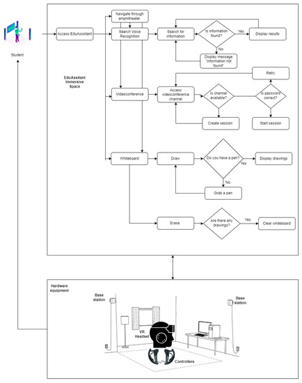 To ensure the students were engaged with the immersive reality, hardware equipment was also required. Valve Index provided the hardware, which consists of a headgear with IPS (in-plane switching), fast switching, two base stations for motion monitoring, and two controllers for VR interaction. EduAssistant has the following key features: a virtual amphitheater, a whiteboard, a video conference system, and voice search recognition. The search feature is based on a dictionary customized for Workflow Management course (Politehnica University of Bucharest, Faculty of Automatic Control and Computer Science). This Workflow Management course provides the knowledge required for the development of the conceptual–theoretical and methodological framework of process analysis based on activity flows, as well as for the comparative analysis of the performances and costs offered by various iterations of activity planning for the realization of a specific business processes. Discrete event dynamic systems using Petri nets are studied in the course. The system workflow is reflected in Figure 2. In the modelling phase, prior to choosing the learning material for VR application, it was essential to hold discussions with expert teachers from Politehnica University of Bucharest and to actively participate in the Workflow Management course.