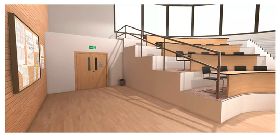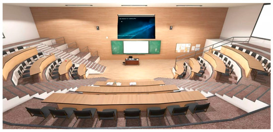 The challenge in creating the immersive space was posed by the need to ensure students’ experience is as close as possible to the classroom reality. In the design phase we took this aspect into consideration and decided, based on the research in the field, that the best approach would be to develop a 3D amphitheater that simulates the physical space of a classroom [23,24]. Josef Buchner and Alberto Andujar mentioned that through VR “teachers can bring distant or even inaccessible places into the classroom as real authentic experiences” [23]. At the same time, for the design phase we considered the most popular amphitheater classes from Politehnica University, which regularly hold between 150 and 250 students to be able to provide the sense of community for them. A list of the items shown in the classroom was created after doing an examination of the space. To represent the objects in immersive motion we created prefab assets with Unity as described in the following: