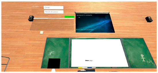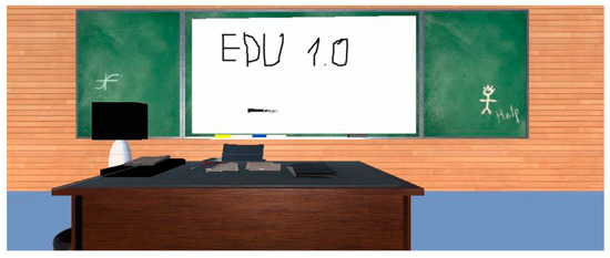 The whiteboard (see Figure 9) was created to facilitate collaboration among students in a 3D environment. VR whiteboards provide an interactive experience in the academic context. Students can perform the same actions they could in a real classroom. Interaction with the whiteboard works via Valve Index controllers. To give the user the opportunity to draw on the whiteboard, we created four markers in four different colors (yellow, black, green, and red). Markers are created as prefabricated variants of the basic (black) marker. Each marker object consists of three elements: a handle that makes it possible to manipulate it in the same way you would manipulate a pen or pencil, a type that resembles the tip or nib of a writing marker or a chalk tip, and a grab point that basically marks where the marker’s tip and its body meet. To render the markers in different colors, we defined materials of various shades that were then applied to each marker. We used C# language to develop the script for drawing. It was necessary to define the Draw() function that makes the drawing possible in VR mode. Each Draw() function is called in the Update() function to update the drawing on the virtual board in real time. The thickness of the drawing line is given by the penSize parameter, which can be set directly in the script, or by selecting the object in the Unity interface and setting its property in the Inspector section.