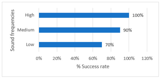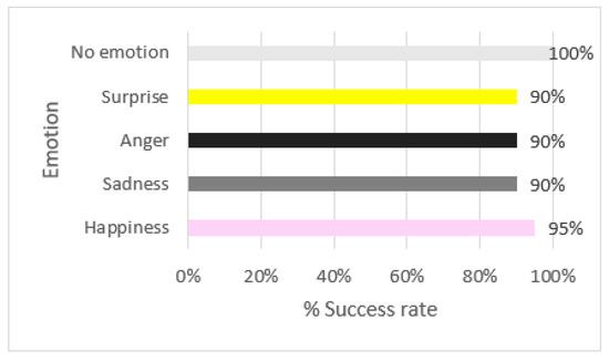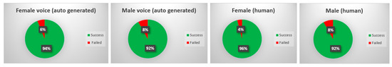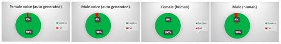 To assess EduAssistant’s voice recognition capabilities, we simulated the experience using a total of 200 voice samples. The samples were divided as presented in Table 1. Two approaches were used for the simulation phase: human voice interaction and machine generated samples. The voice samples were collected from both male and female subjects. Given the diverse environmental conditions under which students interacted with the 3D application, we also took the presence of background noise into account for the purpose of quality assurance. The machine samples were generated using typecast.ai and were acquired from native speakers [34]. A total of 100 samples were generated, with 50 using female voice and 50 using male voices. All auto-generated samples were recorded in a noisy environment. The following emotions were considered: happiness, sadness, anger, and surprise. In total, 30 of the samples were equally divided between low, medium, and high frequencies [35,36]. In terms of human voice, for testing purposes we used both a male and a female. All human voice samples used were from non-native speakers. The subjects performed 50 voice searches each in normal and noisy environments using the same set of emotions stated above. In total, 80 of the searches were made using words or phrases derived from dictionary list and the other 20 were performed using words or phrases that have no correspondence in the dictionary. For each voice sample a test scenario was created and the result considered two aspects: capacity of the system to understand and to return results. The performance of the system was evaluated considering two main criteria: its ability to understand the input and its accuracy in returning results. Expected results were established for each test case scenario, and the actual results were measured to evaluate their correspondence. Actual results were evaluated with 0—fail and 1—success. Scenarios with different results than the expected outcome were considered failed. Results that matched the expected outcome were considered successful.