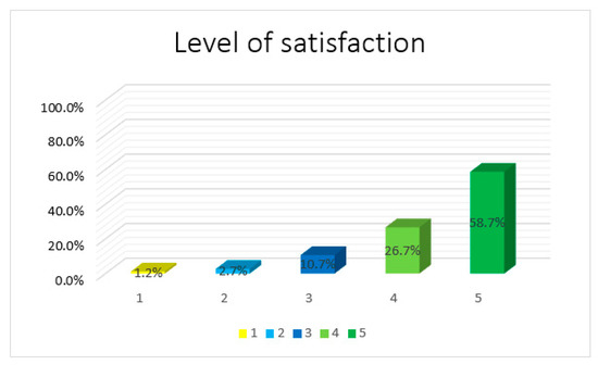 To evaluate the usefulness, satisfaction, engagement, collaboration, and performance of the EduAssistant immersive experience for learning purposes, surveys were performed among 117 students. There were two types of questionnaires: one based on a pre-recorded video and another one based on a real VR experience with the application of the virtual assistant. The set of questions are detailed in Table 2 and Table 3, and they considered several types of answers for responses such as Likert scale from 1 to 5, open- and closed-ended, yes or no. As presented in Table 4, a total of 117 participants were involved in this evaluation. Of these, 97 participants provided feedback after watching a pre-recorded video, while 20 participants tested the VR tool physically and provided their feedback accordingly. For the formulation of all surveys, we used a professor’s (from Automatic Control and Computer Science Faculty) extensive experience in Workflow Management and other studies on the same topic for guidance [37,38]. All questionnaires were anonymous, and participants gave their consent prior to answering the questions. The study was conducted among bachelor’s degree students and master’s degree students and included questions related to participants’ opinion in terms of usefulness, motivation, satisfaction, collaboration, knowledge acquisition about the multimedia resources, immersive space, whiteboard, speech recognition, and video conference features. For each VR activity we designed a specific set of questions, aiming to determine usefulness of multimedia resources and system features and to determine the cognitive impact for students in an educational context. Additionally, students were asked to provide their thoughts and comments with the overall experience. The video was sent to the participants via email and the real VR interaction was conducted with 20 students.