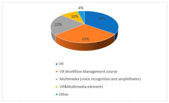 To evaluate the efficacy of the VR-based training in comparison with traditional classroom training, we compared the exam scores of the students who attended the Workflow Management course with those who used the VR tool. The results suggest that the VR tool has an increased efficacy compared to traditional learning (see Figure 25). The findings are corroborated by other studies that have examined the efficacy of VR in enhancing educational outcomes [1,2,3,4]. Tolentine et al. found that the use of VR had a positive impact on students’ cognitive skills and reported that “Most studies used quizzes and exams to measure learning outcomes, and many of them reported better performance among participants who experienced VR-based instruction than those who underwent traditional instruction. VR-based instruction resulted in better exam and quiz scores than traditional instruction” [4] (pp. 728–729). Similarly, Alteneder and Doolean compared the effectiveness of virtual reality and traditional learning and “the results indicate that students in the VR condition significantly outperformed their counterparts in the traditional condition on two out of three knowledge assessments and on a transfer task, indicating the effectiveness of the VR system in teaching students engineering concepts and procedure” [3] (p. 418).