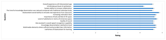 The study included open and closed questions, as well as satisfaction questions rated with a Likert scale from 1 to 5, and its purpose was to measure engagement level, interaction, collaboration, and usefulness of the tool in the field of educationAdditionally, we tried to identify difficulties faced during the study and additional features to enhance the tool in the future. Regarding overall experience, Figure 23 shows that the instrument had a positive impact in terms of students’ sense of community and interaction with the environment. The overall experience with the platform was positive. Students rated the experience with more than 4 out of 5 (see Figure 23). Participants believe that EduAssistant engaged them in VR experience, and they felt motivated to continue studying. The voice recognition option was considered useful, and students considered they were receiving the proper information while using this function. The participants reported encountering some difficulties while using the whiteboard and suggested that improvements should be made to make the drawing experience smoother, as it is currently difficult to have precise control of the pen. The video conference had good sound and video quality and made the interaction with other participants more collaborative. During the interaction in VR mode, we did not observe any significant impairments in regard to the students experience due to latency. Additionally, the majority of the participants considered look and feel really important for fostering immersion and interaction and they believed that simulating a real classroom is a good addition.