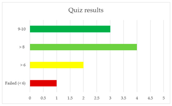 To measure the level of knowledge dissemination, after finishing playing with the VR tool, students were asked to voluntarily participate in an assessment to provide their level of knowledge about the Workflow Management materials presented during VR experience (see Figure 24). In total, 50% of the participants agreed to be part of this action. We considered “passed” a result higher than 6. Only one student did not pass the assessment and most of them achieved a grade higher than 8.
