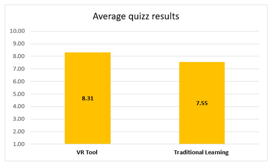 - Efficiency, effectiveness, and high accuracy: The effectiveness of VR-based training was found to be superior to that of traditional classroom training, as demonstrated by a comparison of the exam scores obtained by students who participated in the Workflow Management course using the VR tool, as opposed to those who received instruction in a conventional classroom setting (see Figure 25). The voice recognition feature based on HMM suggests that students can locate information more efficiently compared to manual searching. The usefulness of the HMM was demonstrated by the results obtained in the simulation stage with auto-generated and human voice samples. The confidence level was over 90% for all the simulations (see Figure 15, Figure 16, Figure 17 and Figure 18). Additionally, the quiz proved that voice recognition capability is a good addition for self-learning and knowledge gathering. Using voice recognition technology can save time and reduce the cognitive load on users, as it allows for quick and accurate searches without the need for manual input.