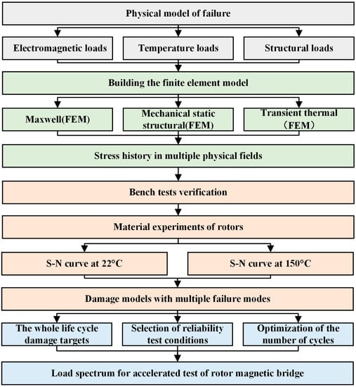 (1) We propose a method for analyzing the failure mode of the magnetic bridge and constructing an accelerated reliability test cycle under multi-physics fields. This method includes establishing a physical model of the rotor failure, simulating and verifying multi-physics field loads, analyzing magnetic bridge damage, establishing life models, determining whole life cycle damage targets, selecting reliability test conditions, optimizing the number of cycles, and compiling an accelerated test load spectrum.