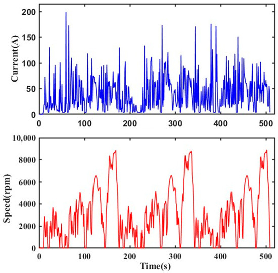 This paper simulates the operation of a motor on a bench test through a finite element analysis (FEA) based on the actual acquisition of motor operation data. The results obtained from the simulation are compared with the load data monitored by the test to demonstrate the accuracy of the simulation model. The dynamic alternating test condition data are shown in Figure 3, with a maximum motor speed of 8907 rpm and a maximum current of 200 A.